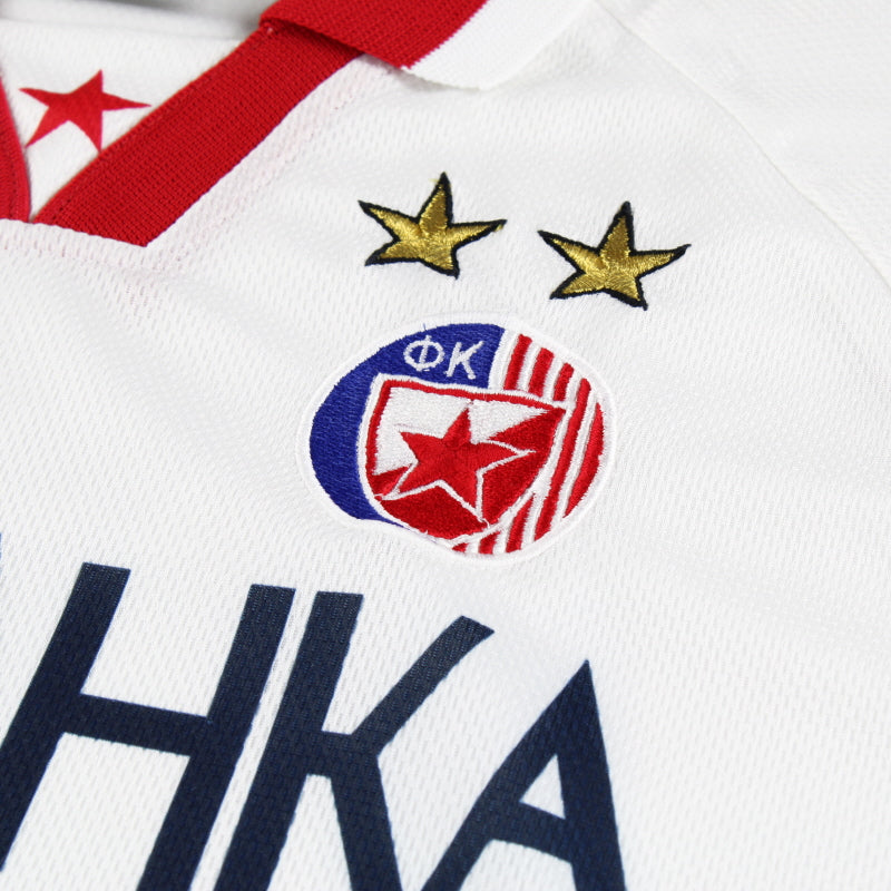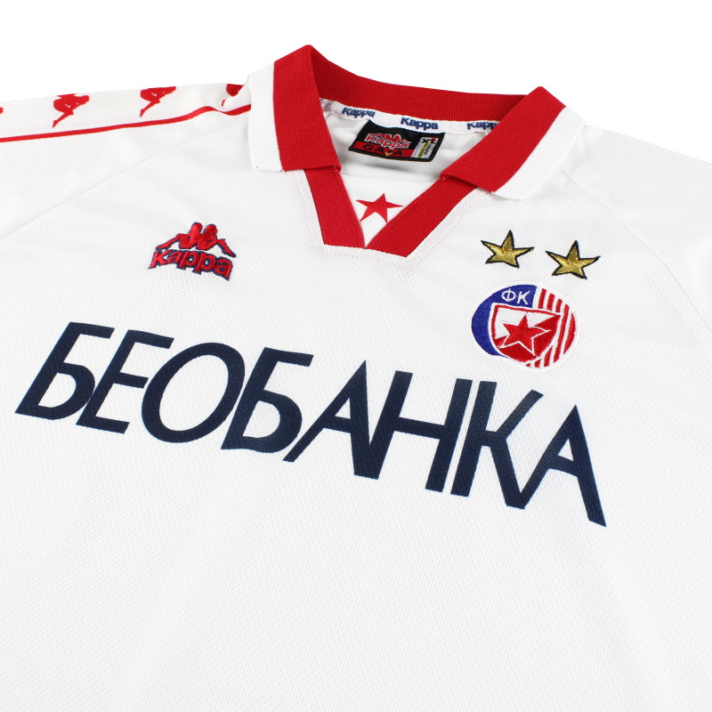 Details - Away shirt as worn when Red Star Belgrade finished as runners up in the First League of FR Yugoslavia, finishing 2 points behind Obilic Beograd, and were knocked out in the semi finals of the FR Yugoslavia Cup, losing 6-5 on penalties against Obilic Beograd after the tie finished 2-2 on aggregate. Also worn when Red Star were knocked out in the first round of the UEFA Cup Winners' Cup, losing 4-3 on aggregate against Germinal Ekeren.