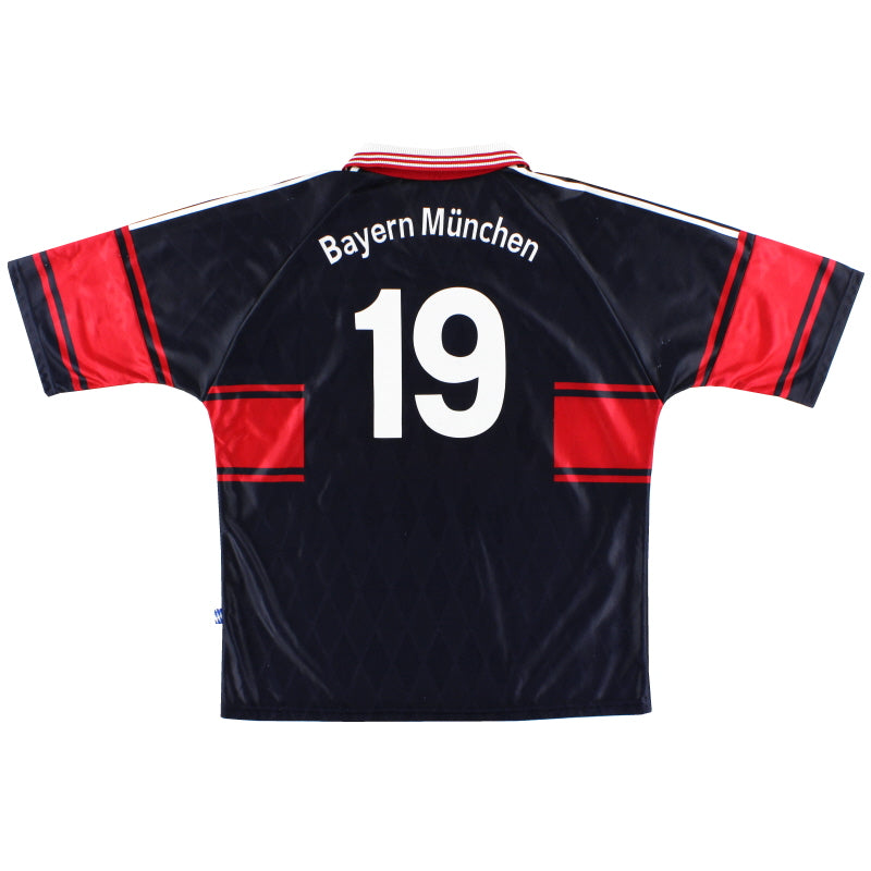 Details - Home shirt worn when Bayern Munich finished as runners up in the Bundesliga in the 1997-98 season, finishing 2 points behind champions Kaiserslautern, before winning the title in the 1998-99 season, finishing 15 points ahead of second placed Bayer Leverkusen. Also worn when Bayern Munich made it to the 1999 Champions League final in a game where they led the match from the 6th minute, but, two injury time goals from Manchester United meant that Bayern Munich would lose the game 2-1.