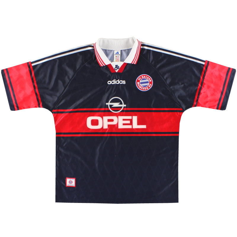 Home shirt worn when Bayern Munich finished as runners up in the Bundesliga in the 1997-98 season, finishing 2 points behind champions Kaiserslautern, before winning the title in the 1998-99 season, finishing 15 points ahead of second placed Bayer Leverkusen. Also worn when Bayern Munich made it to the 1999 Champions League final in a game where they led the match from the 6th minute, but, two injury time goals from Manchester United meant that Bayern Munich would lose the game 2-1.