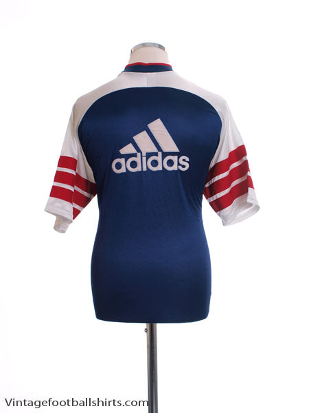 Details - Training shirt as worn when Bayern Munich finished as runners up in the Bundesliga in the 1997-98 season, finishing 2 points behind champions Kaiserslautern, before winning the title in the 1998-99 season, finishing 15 points ahead of second placed Bayer Leverkusen. Also worn when Bayern Munich made it to the 1999 Champions League final in a game where they led the match from the 6th minute, but, two injury time goals from Manchester United meant that Bayern Munich would lose the game 2-1.