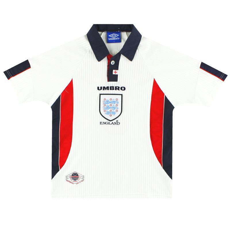 Details - Home as worn when England played Argentina in the second round of France 1998, When a young Michael Owen scored one of the goals of the tournament, but it wasn't enough for England to advance in the competition, losing 4-3 on penalties. Also remembered for the Beckham sending off incident for lashing out at Simeone.