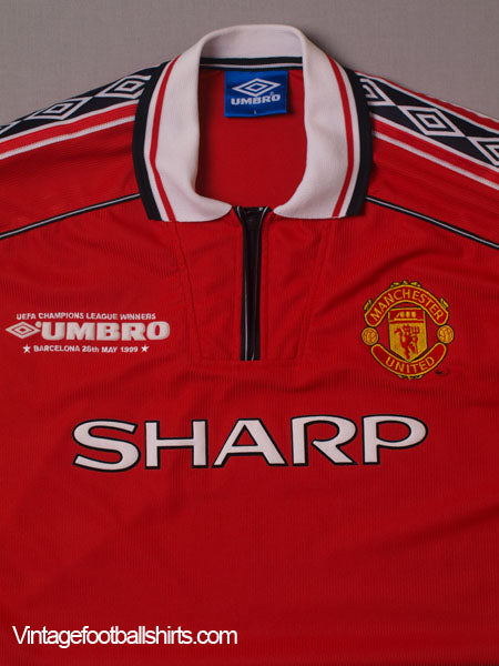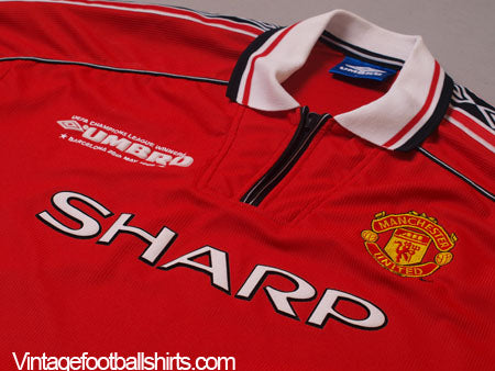 Details - Home shirt to celebrate when United made history by becoming the first English team to complete the treble. The league title was contested all the way until the final game of the season where only a win would be enough with only a point seperating United and Arsenal. A 2-1 win over Spurs saw United crowned Champions of England. The FA Cup saw United face Newcastle at Wembley where The Red Devils showed exactly why they were League Champions with a 2-0 win. Fours days later the treble was complete