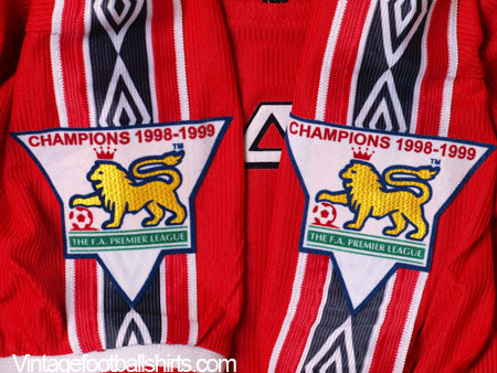 Details - Classic Home shirt as worn when United made history by becoming the first English team to complete the treble. The league title was contested all the way until the final game of the season where only a win would be enough with only a point separating United and Arsenal. A 2-1 win over Spurs saw United crowned Champions of England. The FA Cup saw United face Newcastle at Wembley where The Red Devils showed exactly why they were League Champions with a 2-0 win. Fours days later the treble was complete