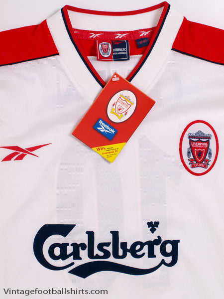 Details - Away shirt as worn when Gerard Houillier became joint manager with Roy Evans in the 1998-99 season, with Evans leaving in November, leaving Houillier to lead Liverpool to a 7th place Premier League finish. Also worn when Liverpool were knocked out in the third round of the UEFA Cup, losing 4-1 on aggregate against Celta Vigo.