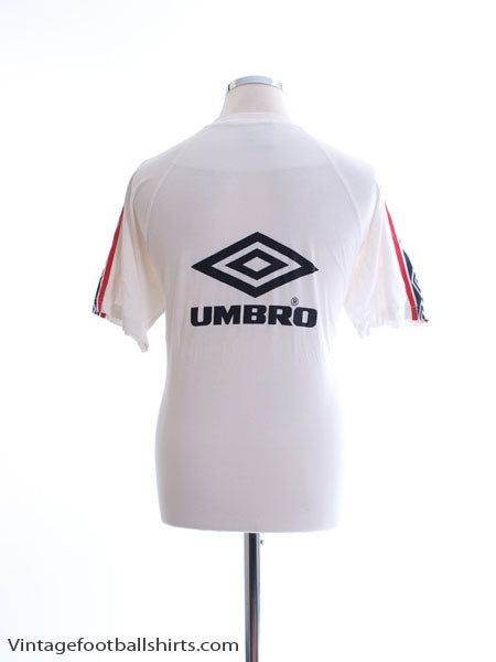 Details - Training shirt as worn when United made history by becoming the first English team to complete the treble. The league title was contested all the way until the final game of the season where only a win would be enough with only a point separating United and Arsenal. A 2-1 win over Spurs saw United crowned Champions of England. The FA Cup saw United face Newcastle at Wembley where The Red Devils showed exactly why they were League Champions with a 2-0 win. Fours days later the treble was complete.