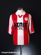 Details - Home shirt as worn when Olympiakos finished as champions of the Alpha Ethniki, finishing 4 points ahead of second placed Panathinaikos, and were knocked out in the quarter finals of the Greek Cup, losing 4-1 on aggregate against eventual winners AEK Athens. Also worn when Olympiakos were knocked out in the third round of the UEFA Cup, losing 4-3 on aggregate against Juventus, after finishing 3rd in their Champions League group behind Real Madrid and Porto.