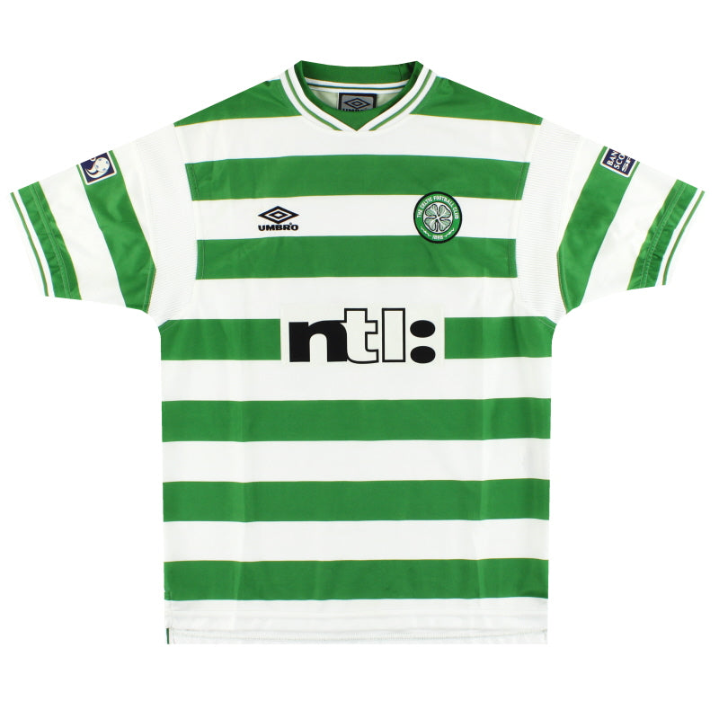 Details - Home shirt as worn when Celtic finished as runners up in the Scottish Premier League in the 1999-00 season before finishing as champions of the Scottish Premier League in the next season and won the 2001 Scottish Cup final, beating Hibernian 3-0 in the final. Also worn when Celtic won back to back Scottish League Cup finals, beating Aberdeen and Kilmarnock in respective seasons.