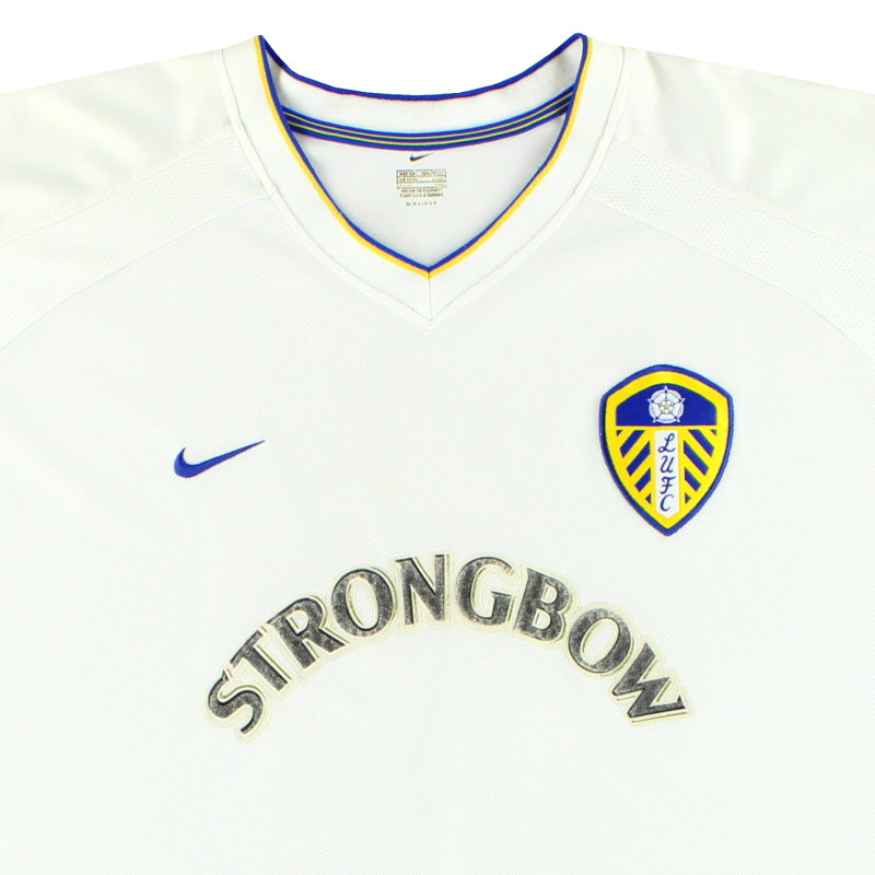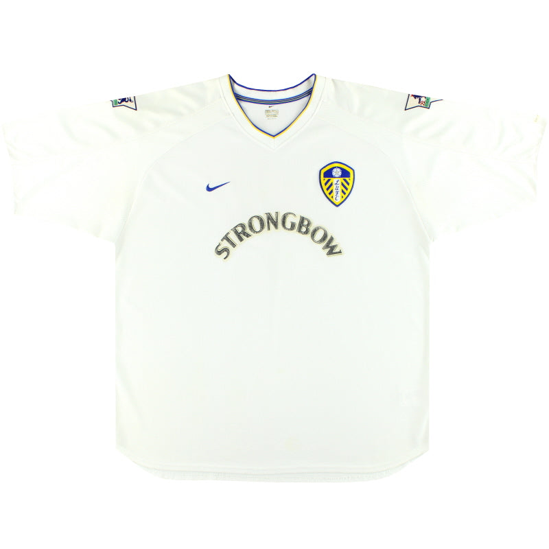 Home shirt as worn when Leeds United finished 4th and 5th respectively in the Premier League and were knocked out in the third round of the 2001-02 FA Cup, losing 2-1 against Second Division side Cardiff City after going into the game as Premier League leaders. Also worn when Leeds were knocked out in the semi finals of the 2000-01 Champions League, losing 3-0 on aggregate against Valencia.