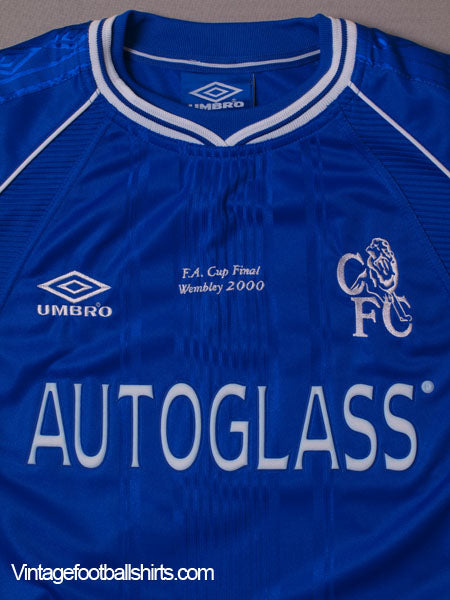 Details - Home shirt as worn in the 2000 FA Cup Final against Aston Villa, Chelsea won the match 1-0 with a great strike from Roberto Di Matteo. The game was the last FA Cup final to be played at the old Wembley