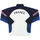 Details - Track jacket as worn in the 2002 World Cup when France failed to make it out of their group as defending champions, failing to win a game, only managing to accumulate 1 point in a 0-0 draw against Uruguay coming in between defeats against Senegal and Denmark.