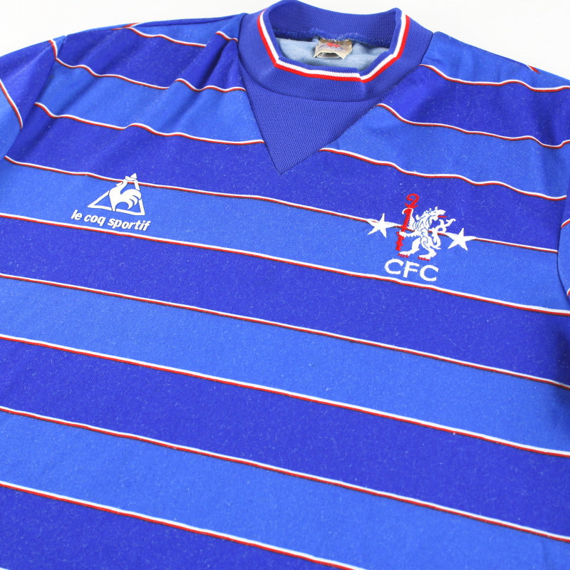 Home shirt as worn when Chelsea were promoted to the First Division in the 1983-84 season, finishing as champions of the Second Division, before finishing 6th in the First Division in the next season under John Neal. Also worn when Chelsea made it to the semi finals of the 1984-85 League Cup, being knocked out of the competition after losing 5-2 on aggregate against Sunderland.