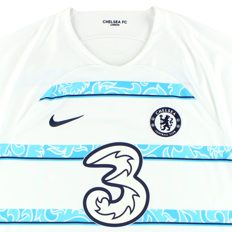 Away shirt as worn when Chelsea were looking to improve on their 3rd place finish in the Premier League in Todd Boehly's first full season as owner. Chelsea finished the season in mid table in the Premier League with a disappointing start to the season leading to the sacking of Thomas Tuchel. Graham Potter took over as manager and form did not improve with Chelsea only winning 12 of their 31 games with Graham Potter as manager before Frank Lampard took over as interim manager until the end of the season.