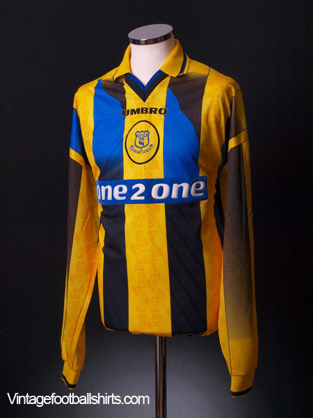 Details - 1996-98 Match Worn Away Shirt in excellent condition, embroidered Umbro logo, thicker stiching on the Everton badge, rare One2One sponsor which was never released to the public, and embroidered 'Everton fc' on bottom of shirt. Comes with Premiership arm patches and Number 9 Ferguson to rear.