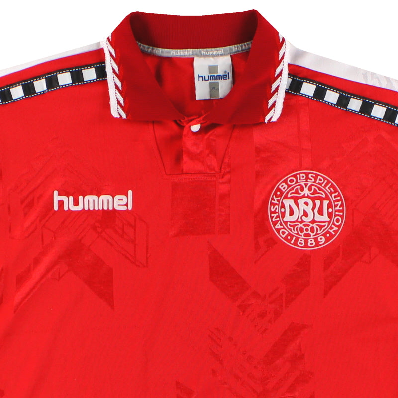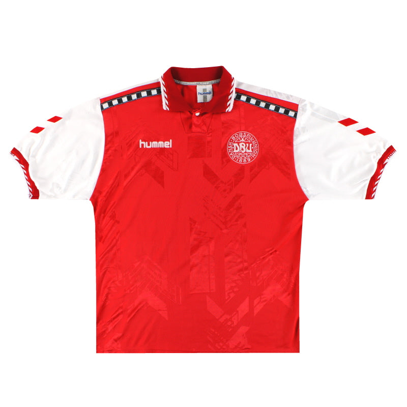 Home shirt as worn when Denmark were competing in the 1996 European Championships, finishing 3rd in their group after entering the tournament as defending champions.