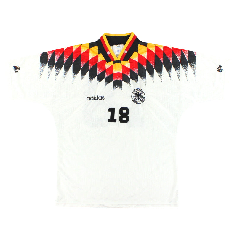 Classic home shirt as worn when Germany entered the 1994 World Cup Finals as defending champions, but they were upset by Bulgaria in the quarter finals, losing 2-1 with Yordan Letchkov scoring the winning goal in the 78th minute for Bulgaria.