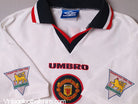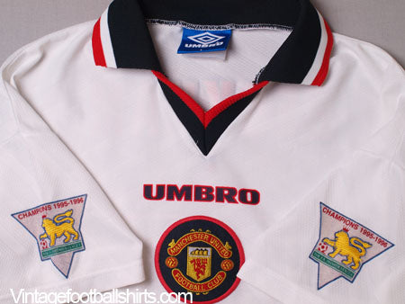 Details - Away Shirt worn in a top of the table clash at Anfield versus Liverpool, which United won 3-1, Gary Pallister headed in a David Beckham cross to give United the lead before John Barnes equalised for Liverpool. However, United defender Pallister then repeated his goal scoring heroics and a howler from Liverpool goalkeeper David James handed Andy Cole the simple task of hitting United's third to give Sir Alex Ferguson's side the points and, effectively, the title.