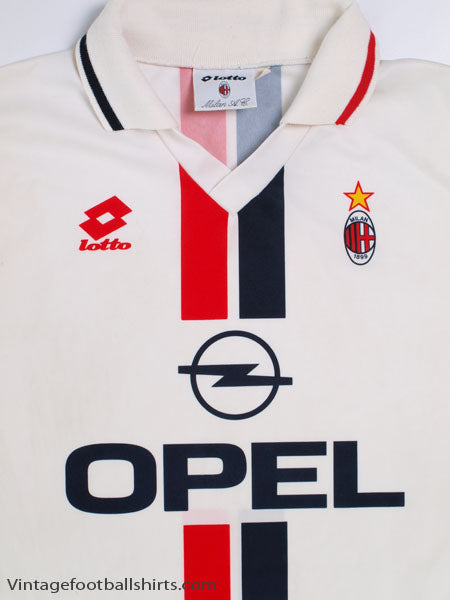 Details - Away shirt as worn when AC Milan gained their fifteenth Italian Championship led by famous world-class players such as Roberto Baggio, Marco Simone and George Weah under manager Fabio Capello. Also worn when AC Milan were knocked out in the quarter finals of the UEFA Cup, losing 3-2 on aggregate against Bordeaux.