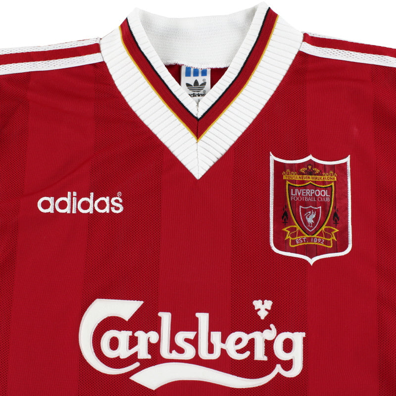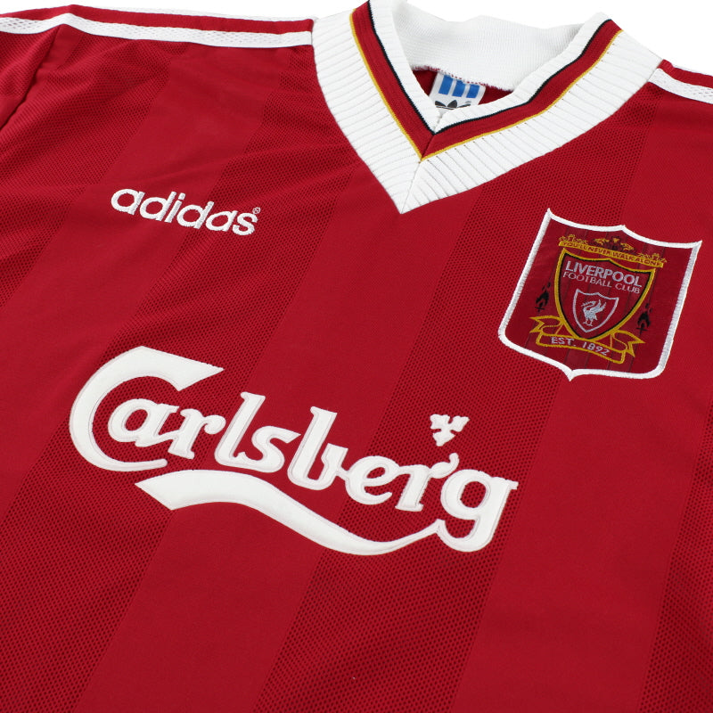 Details - Home shirt as worn when Liverpool finished 3rd in the Premiership under manager Roy Evans, and was worn in the epic game against Newcastle at Anfield ending in a 4-3 victory. Also worn when Liverpool made it to the final of the FA Cup, losing 1-0 against Manchester United with Eric Cantona scoring the winner in the 85th minute.