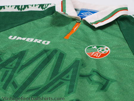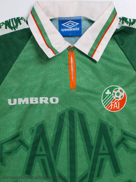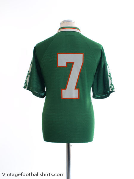 Details - Match issue home shirt believed to have been worn by or issued to #7 of Ireland during the 1996-98 seasons when Ireland competed in qualification for the 1998 World Cup, failing to qualify for the competition after losing 3-2 on aggregate against Belgium in a play off.