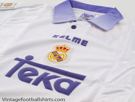Details - Home shirt as worn when Jupp Heynckes took over as Real Madrid manager, failing to defend their La Liga title from the previous season, finishing 4th in the league. However, the club did manage to win their 7th European title, beating Juventus 1-0 in the Champions League final with Predrag Mijatovic scoring the only goal of the game. The club's European triumph was not enough to save Heynckes from the sack at the end of the season after a poor domestic campaign.