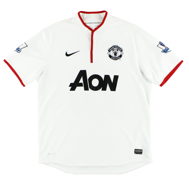 Details - Away shirt as worn in Sir Alex Ferguson's final season in charge of Manchester United before retirement. Manchester United won the Premier League title for the 20th time after a Robin van Persie hat trick against Aston Villa clinched it with 4 games still to play. Then it was used as a third shirt the next season when David Moyes took charge of Manchester United but failed to impress and was eventually sacked and replaced by interim manager Ryan Giggs.