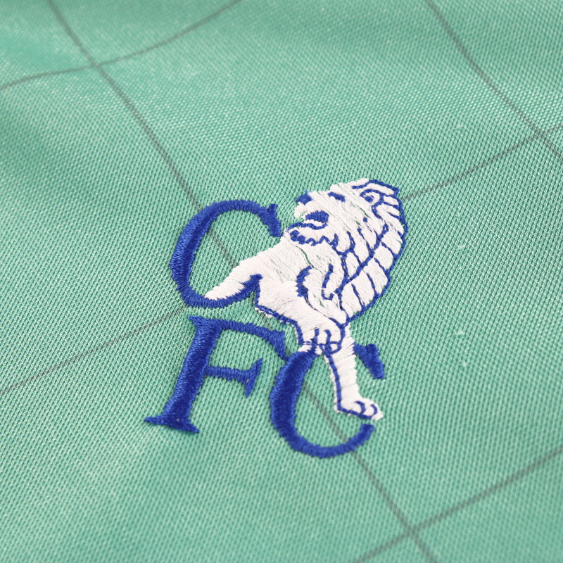 Very rare classic jade away shirt with diagonal pinstripe design, as worn when Chelsea were relegated from the First Division - after losing 2-1 on aggregate against Middlesbrough in the play offs - before coming straight back up in the next season after finishing as champions of the Second Division.
