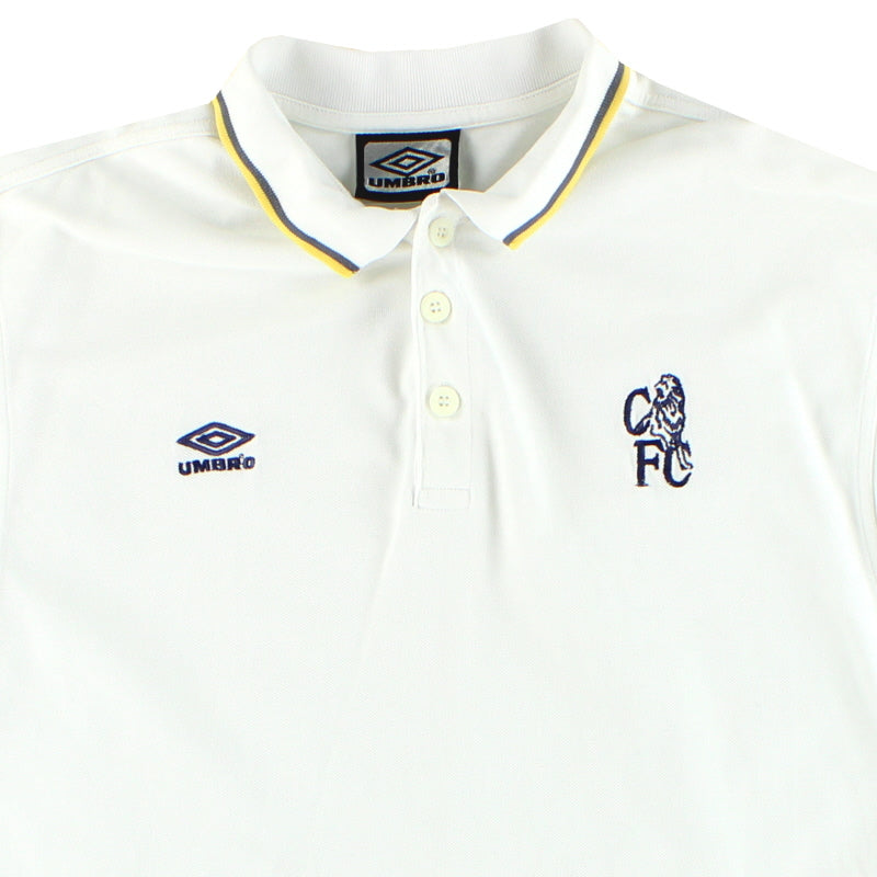 Polo shirt as worn when Chelsea finished 5th and 6th respectively in the Premier League and won the 2000 FA Cup final, beating Aston Villa 1-0 with a great strike from Roberto Di Matteo in the last FA Cup final to be played at the old Wembley. Also worn when Chelsea made it to the quarter finals of the 1999-00 Champions League, losing 6-4 on aggregate against Barcelona.