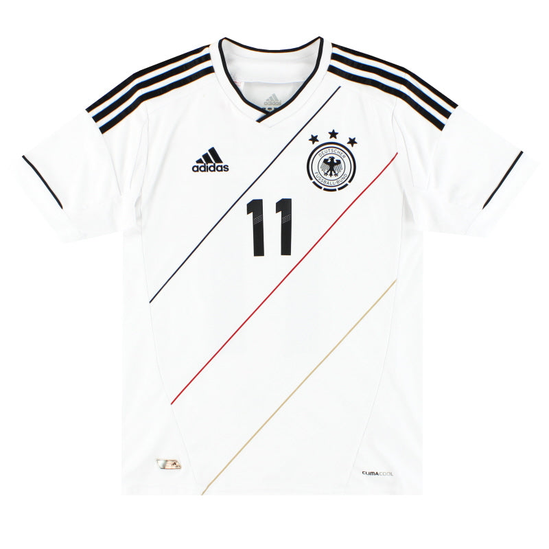 Details - Home shirt as worn when Germany were competing in the 2012 European Championship in Poland and Ukraine. The Germans strolled through the group stages with maximum points, beating Portugal, Denmark and Holland. A 4-2 win over Greece saw them progress to the semi-finals. The Italians took a 2 goal lead and despite a late goal from Ozil they were eliminated from the tournament.
