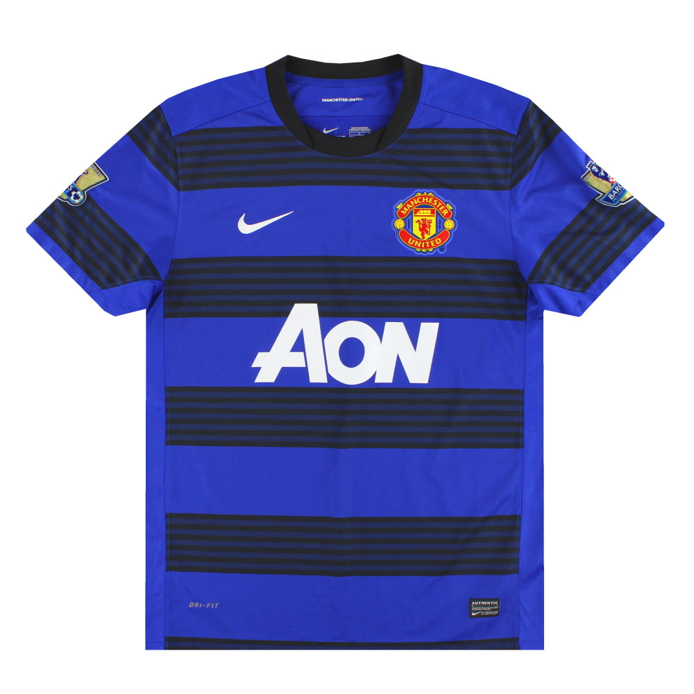 Away shirt as worn when Manchester United were looking to defend the Premier League title they won in the previous season and claim a record 20th Premier League title. The title fight went down to the final day of the season with Manchester United top of the table on the full time whistle of their game against Sunderland, but 2 injury time goals by Manchester City against QPR meant that United would finish behind their local rivals on goal difference. Also worn in the following season when Manchester United regained the Premier League, winning the competition for a 20th time after finishing 11 points clear of second placed Manchester City.