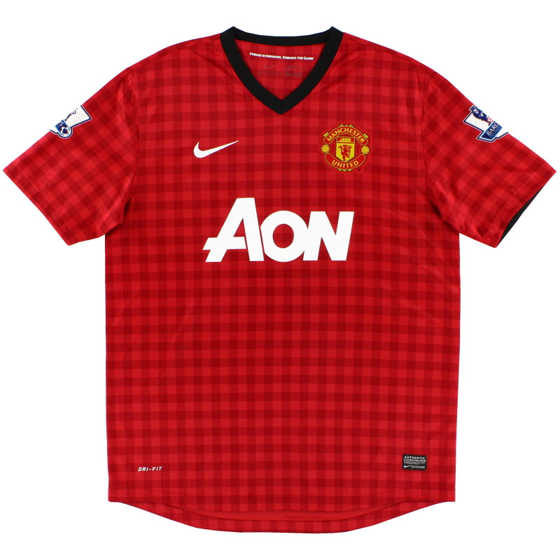 Details - Home shirt as worn in Sir Alex Ferguson's final season in charge of Manchester United before retirement. Manchester United won the Premier League title for the 20th time after a Robin van Persie hat trick against Aston Villa clinched it with 4 games still to play.
