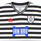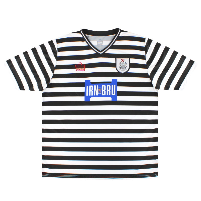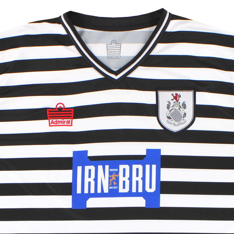 The Admiral Queens Park FC 2020-21 home shirt showcases the club's classic style, featuring slim black and white hoops across the front and sleeves, complemented by popular sponsor Iron Bru.