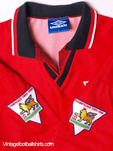 Features - Cantona #7 to reverse in original felt print, Premier League 'Champions 1993-94' patches to sleeves