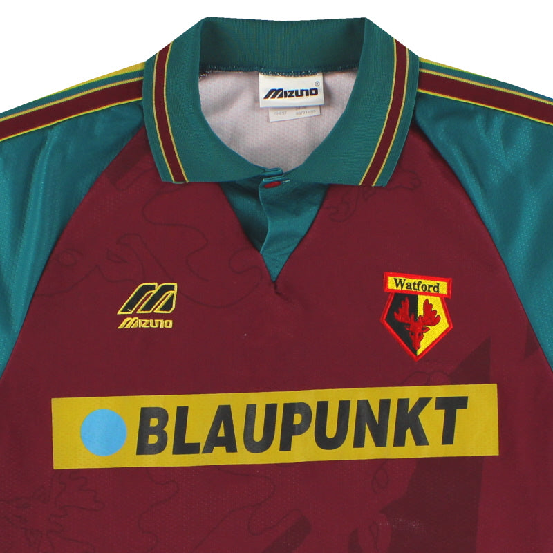 Details - Away shirt as worn when Watford were relegated from the First Division, finishing 4 points away from safety, and were knocked out in the third round of both the FA and League Cup, losing against Wimbledon and Blackburn Rovers in respective seasons.