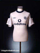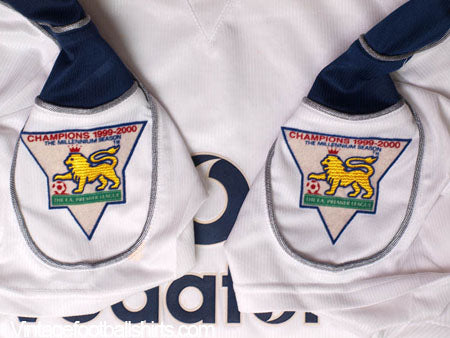 Details - White away shirt as worn when the side won the Premiership for the third successive season, with veteran striker Teddy Sheringham finishing as Manchester United's top scorer on 21, and collecting the PFA Player of the Year Award. Manchester United also made it to the quarter finals of the Champions League, losing 3-1 on aggregate against Bayern Munich