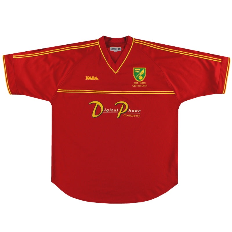 Details - Centenary home shirt as worn when Norwic City finished 6th and 8th in the First Division in respective seasons, failing to earn promotion to the Premeir League in the 2001-02 season after losing 4-2 on penalties against Birmingham City in the play off final after the tie finished 1-1 on after extra time.
