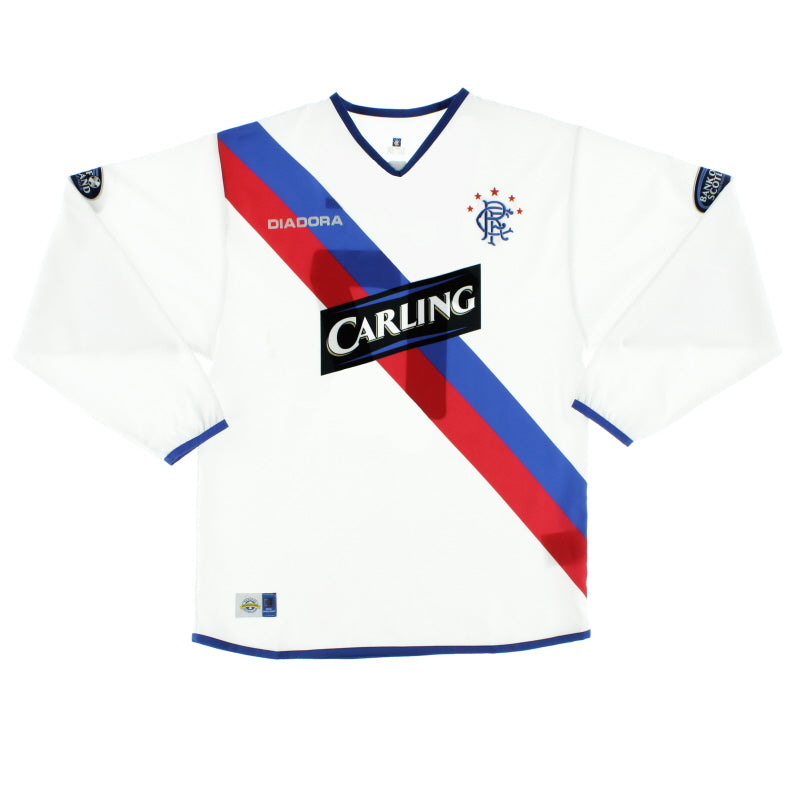 Details - Away shirt as worn when Rangers finished as champions of the Scottish Premier League, finishing 1 point ahead of second placed Celtic, and won the Scottish League Cup, beating Motherwell 5-1 in the final. Also worn when Rangers were knocked out in the group stages of the UEFA Cup, finishing 4th in their group behind AZ Alkmaar, Auxerre and GAK, after being knocked out in the third qualifying round of the Champions League, losing 3-2 on aggregate against CSKA Moscow.