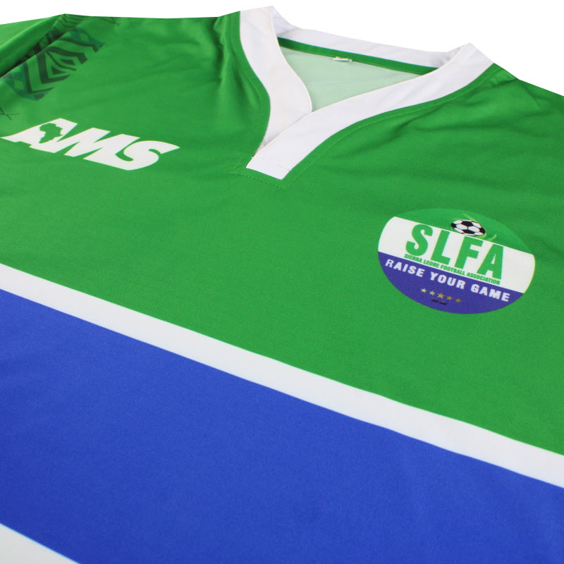 Details - Home shirt as worn in the qualification games for the 2015 Africa Cup of Nations. The team beat Swaziland in the first round over 2 legs. In the 2nd round they advanced after Seychelles withdraw. Although being 2-0 down from the first leg, Seychelles were forced to withdraw after the Seychelles immigration authorities barred Sierra Leone from entering their country over fears of the Ebola outbreak. Sierra Leone intimately finished bottom of their group with just 1 point and failed to qualify