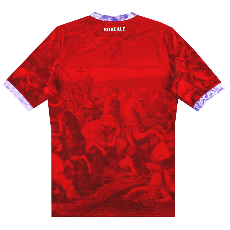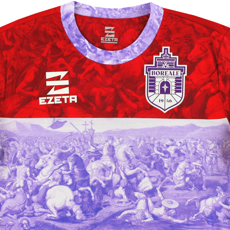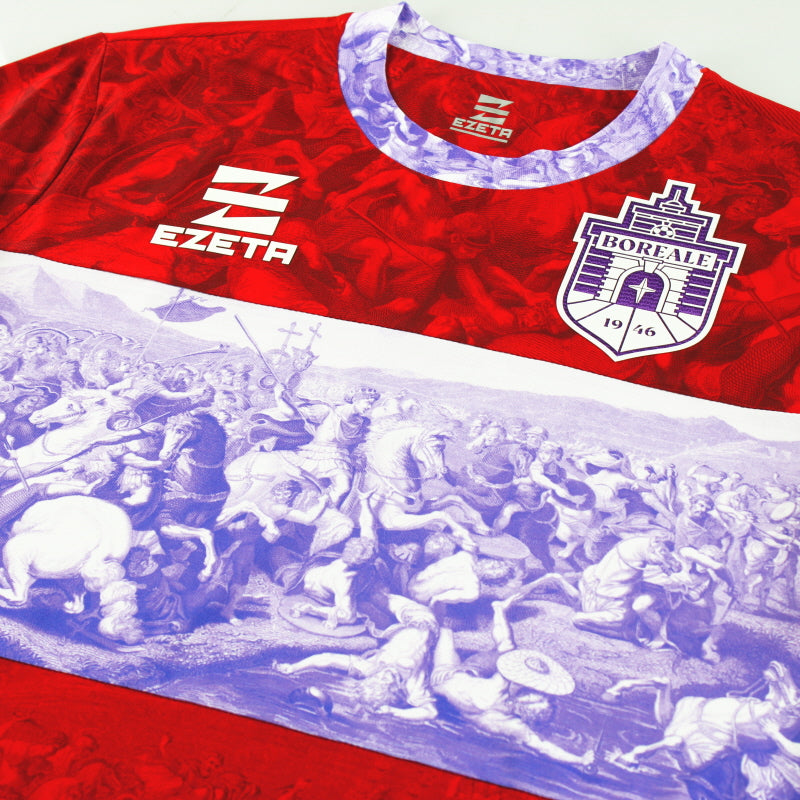 Fourth kit which has artwork of the Battle of the Milvian Bridge by Giulio Romano sublimated into the material and a panel across the chest which shows the painting in its full form in two tone purple and white. Both kits have purple collars and cuffs.