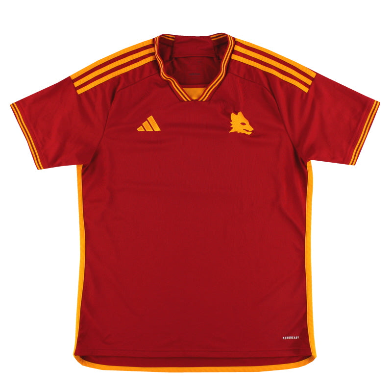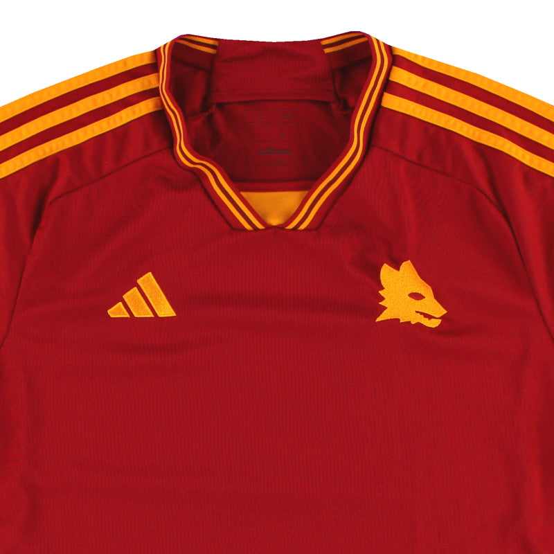 Three decades after its last appearance, adidas returns to AS Roma’s shirt with a design inspired by the 1990s, particularly the 1992-93 season. The home shirt for the 2023-24 season features a minimalist and classic design, celebrating the club’s traditional colors. The timeless red base is accented with yellow detailing, creating a look steeped in heritage. The iconic 'Lupetto' emblem, a wolf head designed by Piero Gratton in 1978, makes its return, positioned on the left of the shirt. This symbol, deeply rooted in the club’s history, now complements the adidas logo on the opposite side of the shirt.