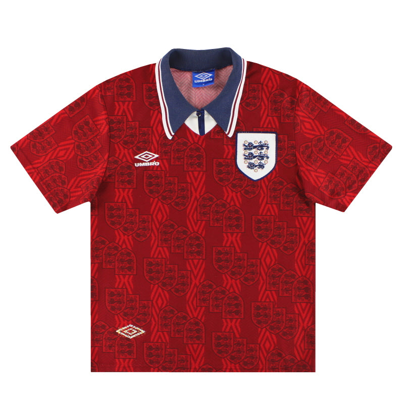 Away shirt as worn in the abandoned friendly match against Ireland where crowd violence caused the game to be stopped after 27 minutes. Also when they lost to Brazil 3-1 in the Umbro Cup at Wembley