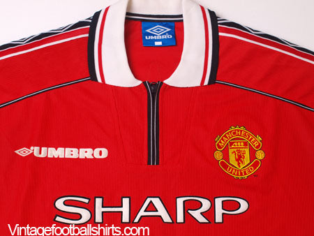 Details - Home shirt to celebrate when United made history by becoming the first English team to complete the treble. The league title was contested all the way until the final game of the season where only a win would be enough with only a point seperating United and Arsenal. A 2-1 win over Spurs saw United crowned Champions of England. The FA Cup saw United face Newcastle at Wembley where The Red Devils showed exactly why they were League Champions with a 2-0 win. Fours days later the treble was complete
