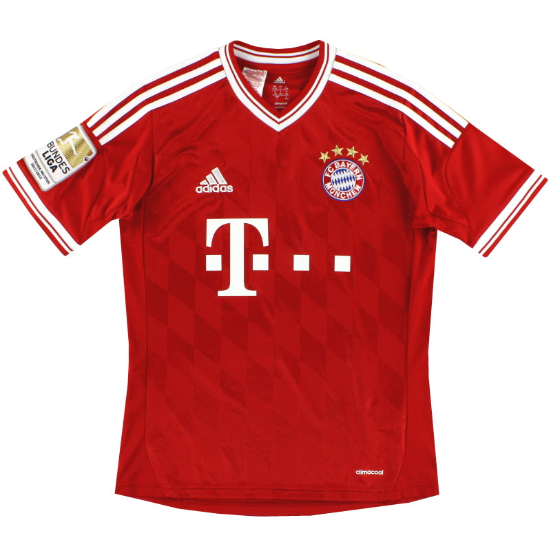 Details - Home shirt as worn when Bayern Munich finished as champions of the Bundesliga, finishing 19 points ahead of second placed Dortmund, and failed to defend their Champions League title, losing 5-0 on aggregate against Real Madrid in the semi finals. Also worn when Bayern Munich won the DFB-Pokal, beating Dortmund 2-0 after extra time in the final, and also won the FIFA Club World Cup, beating Raja Casablanca 2-0 in the final.