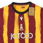 Home shirt Blending tradition with a contemporary flair, the 2024-25 Bradford City AFC home shirt by Macron celebrates the club’s proud heritage and vibrant identity. It showcases the classic claret and amber colours in a striking brushstroke-style stripe design, enhanced by a subtle embossed “BC” motif woven throughout the fabric.