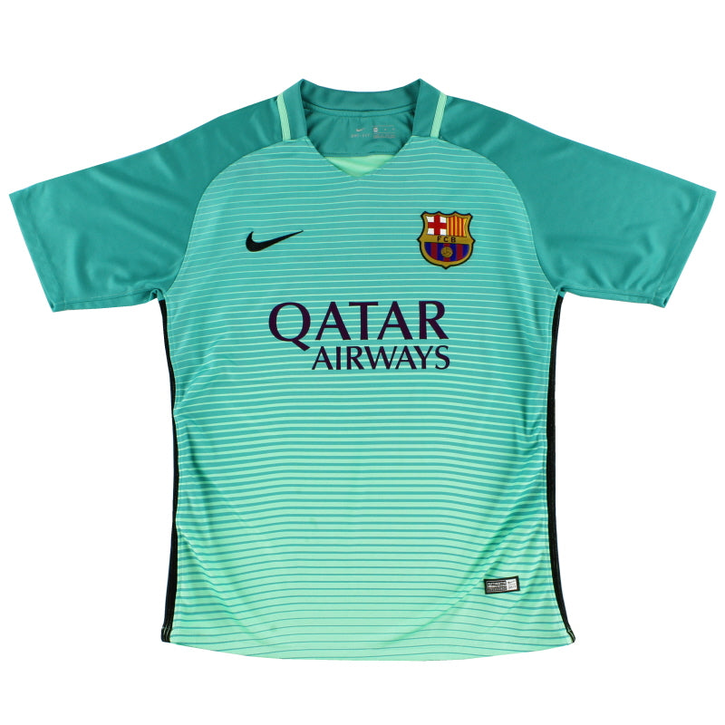 Details - Third shirt as worn in Luis Enrique's last season in charge of Barcelona, failing to defend their La Liga title, finishing 2nd, 3 points behind champions Real Madrid, and were knocked out in the quarter finals of the Champions League, losing 3-0 on aggregate against Juventus. The club did however manage to win the Copa del Rey, beating Deportivo Alaves 3-1 in the final.