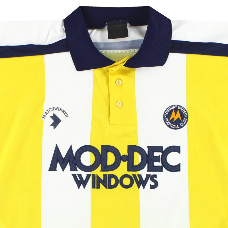 Home shirt as worn when Torquay were relegated from the Third Division in the 1991-92 season, finishing 23rd, before finishing 19th in the newly formed Third Division in the next season. Also worn when Torquay were knocked out in the second round of the 1991-92 FA Cup, losing 4-3 against Farnborough Town in a replay.