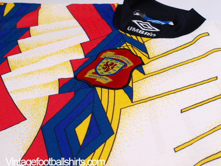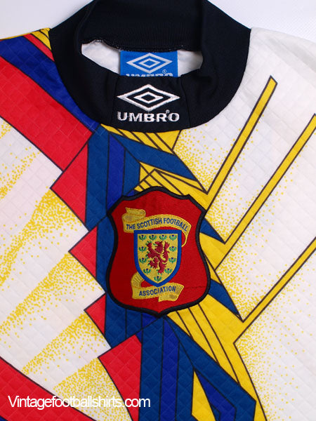 Details - Goalkeeper shirt as worn when Scotland successfully qualified for the 1996 European Championships after finishing as runners up in their qualification group, 3 points behind group winners Russia.