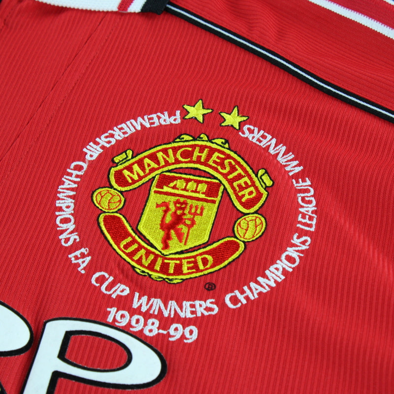 Details - Classic home shirt as worn when United made history by becoming the first English team to complete the treble. The league title was contested all the way until the final game of the season where only a win would be enough with only a point separating United and Arsenal. A 2-1 win over Spurs saw United crowned Champions of England. The FA Cup saw United face Newcastle at Wembley where The Red Devils showed exactly why they were League Champions with a 2-0 win. Fours days later the treble was complete.