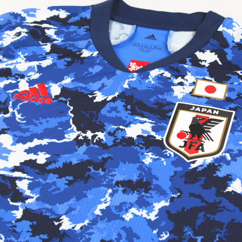 Blue camo home shirt as worn by Japan during the World Cup Qualifiers in which they were successful in gaining their place at the World Cup in Qatar in 2022, with wins over Australia, Paraguay, and a outstanding 10-0 win over Myanmar.
