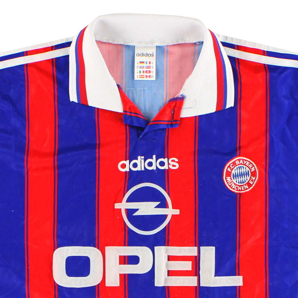 Being a Bayern Munich shirt collector must require a lot of storage space as the German giants have worn an incredible number of kits in the past 30 or so years. Red of course is the favoured home colour (although originally white shirts were worn with red only arriving in 1905 when the side joined forces with Munchner Sport-Club who insisted on changing the jersey colour) and on more than one occasion the side have worn several different designs of home kit in the same season. Bayern are also one of the leading pioneers of adopting a completely different kit for Champions League and Cup games - often in a totally different colour. Although white has always been used to trim the Bayern shirt in the early 90s blue also began to creep in as an additional trim colour culminating in the Barcelona-like 1995 striped jersey. More recently red and white hoops or stripes have also been sported. The Bayern shirt is also renowned amongst football kit afficiandos for having the club name printed on the back of the shirt - probably something to do with the fact that in recent years a badge didn't appear regularly on the front of the jersey until 1989! White shirts are the most traditional Bayern change outfits although in the 80s and 90s the club had an unusual tradition of wearing yellow and green for luck when playing their rivals FC Kaiserslautern. The club have stayed loyal to local suppliers when it comes to kit and have been with adidas since the early 1970s. In fact for several years adidas also acted as shirt sponsor for the side before being replaced by Magirus Deutz in 1979. Iveco, Commodore and Opel have subsequently sponsored the team with mobile phone company T-Mobile arriving in 2002.