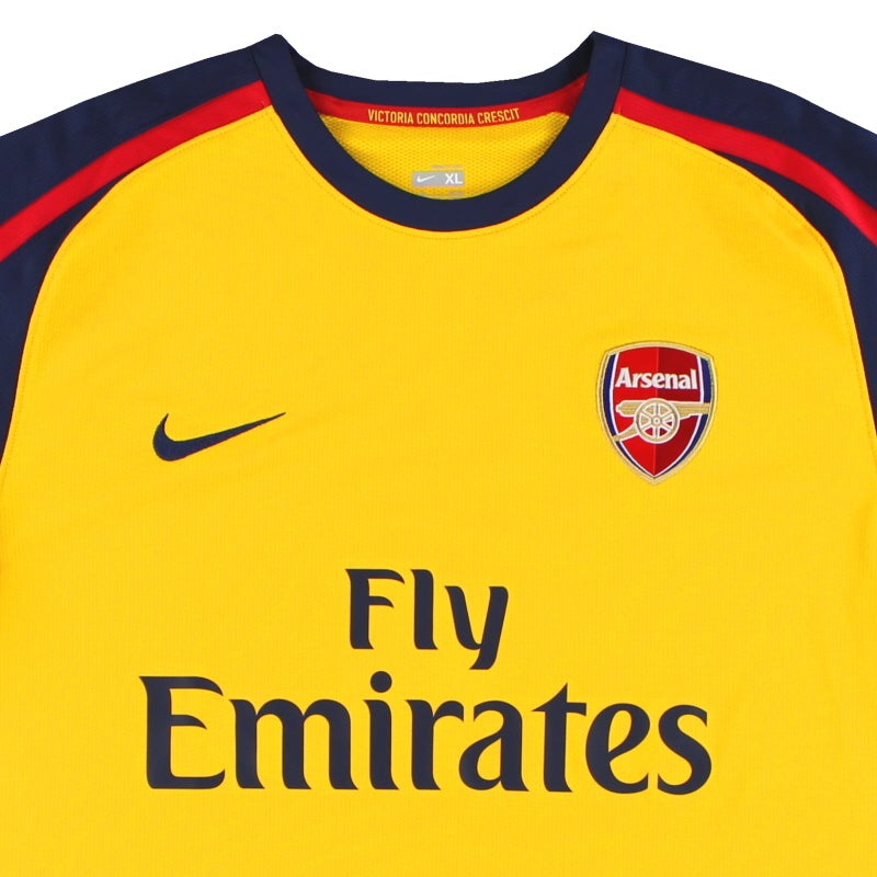 Arsenal were founded as Dial Square FC in 1886 and have Nottingham Forest to thank for their first ever kit. When several ex-Forest players joined the side they brought with them their old red football jerseys and it was decided that the most economical way to kit out the team was in the same colour. The jersey was dark red (or redcurrant as it was renamed when Nike memorably resurrected the design in 2005 to commemorate the club’s last season at Highbury) and was paired with white shorts and dark red or navy socks. The iconic Arsenal kit of red football shirts and white sleeves first appeared in 1933 when then manager Herbert Chapman devised the design in an attempt to create a more distinctive strip for his team. Legend has it that inspiration came from an individual Chapman spotted at Highbury who was wearing a red tank-top over a plain white shirt. The highly individual look is much loved by Arsenal fans who were delighted when Nike launched a classic interpretation of the jersey in 2010 after a few years of ‘tampering’. Gooners are equally as passionate about their preferred away kit colours and almost unanimously opt for yellow and blue - a colour scheme that gained popularity in the 1970s. Prior to then, white and occasionally navy football shirts were the away colours of choice. Navy has actually played an important part in Arsenal’s colour identity over the years and has featured in many home and away kits. Arsenal embraced shirt sponsorship in 1981 when they struck a deal with Japanese electronics company JVC. The relationship was to last until 1999 and since then the company have only had three sponsorship deals: Sega/Dreamcast, O2 and Emirates Airlines, creating one of the smallest sponsor role calls in English football